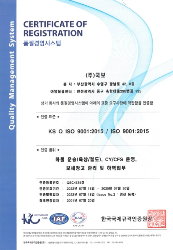 ISO9001/ISO14001의 인증을 통한 국제기준 물류서비스를 제공하고 있습니다.