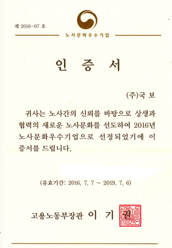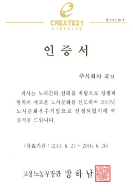 국보의 모든 임직원 일동은 변화, 도전, 창의적 사고를 바탕으로 "국보 100년"을 향해 고객이 만족하는 최고의 기업으로 재도약하여 여러분의 성원에 보답할 것이며, 대한민국 최고의 종합 기업으로서 거듭날 것을 약속드립니다.